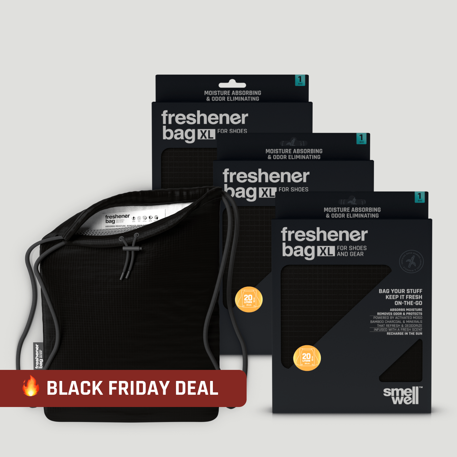 - Absorbs odor and moisture and makes your stuff SmellWellTM.